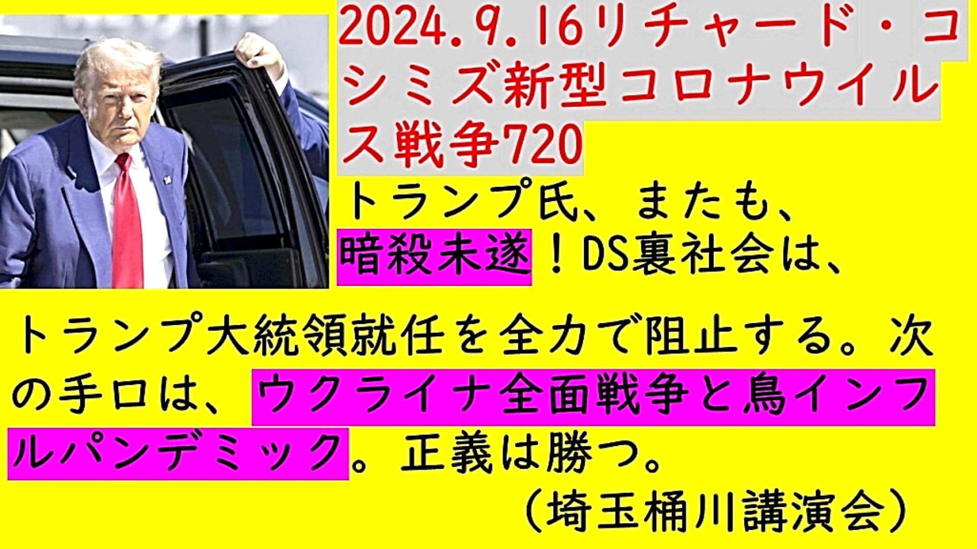 「『ドナルド・トランプ氏』、またも、『暗殺未遂』!『DEEP STATE裏社会』は、『ドナルド・トランプ大統領就任』を『全力』で『阻止』する。次の『手口』は、『ウクライナ全面戦争』と『鳥インフルエンザパンデミック』。『正義は勝つ』」 |