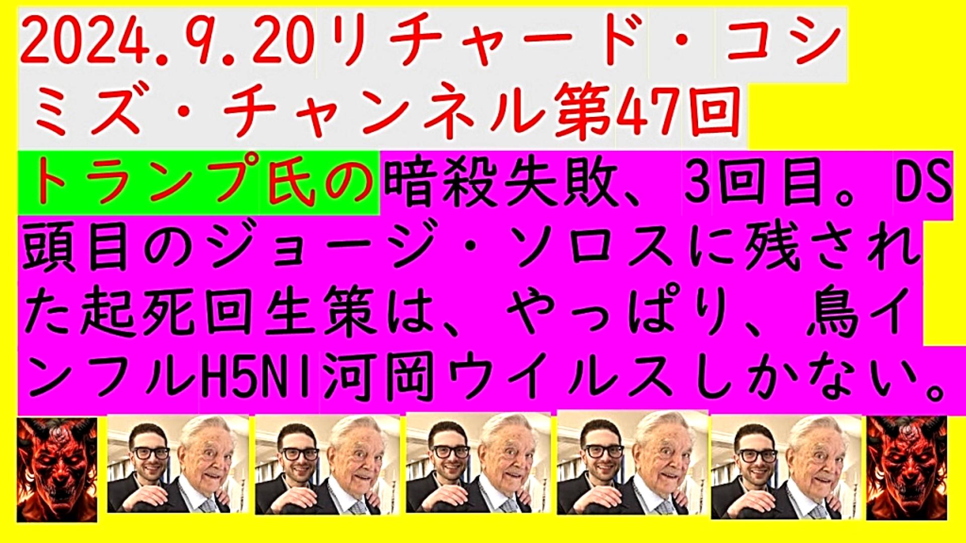 「『ドナルド・トランプ氏』の『暗殺失敗』、『3回目』。『DEEP STATE 頭目』の『ジョージ・ソロス』に残された『起死回生策』は、やっぱり、『鳥インフルエンザH5N1河岡ウイルス』しかない」 |