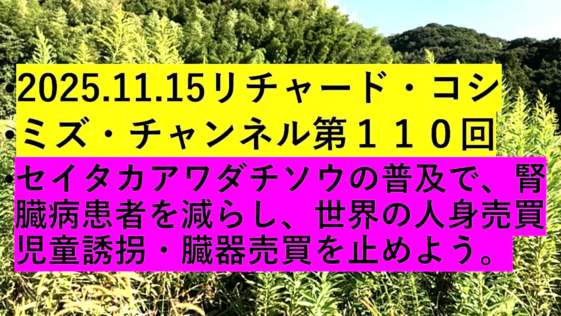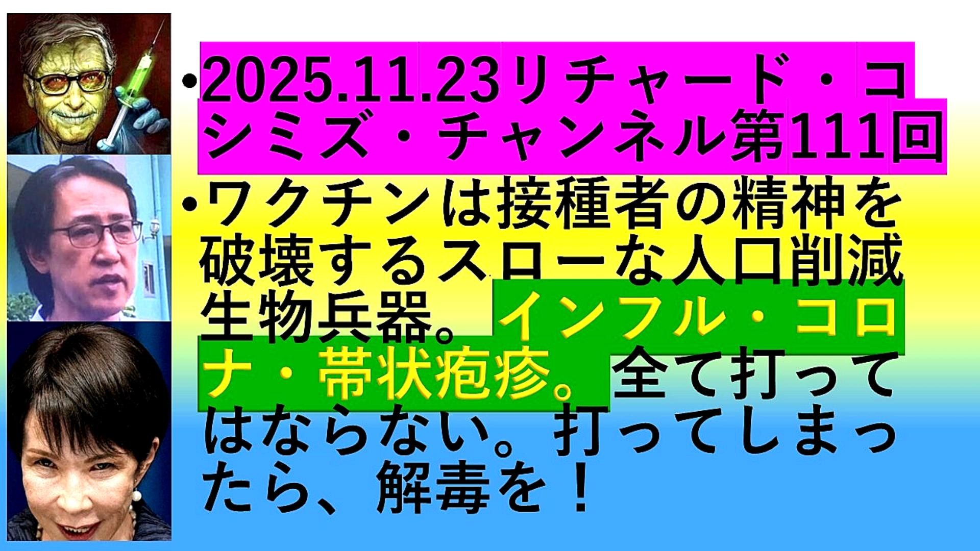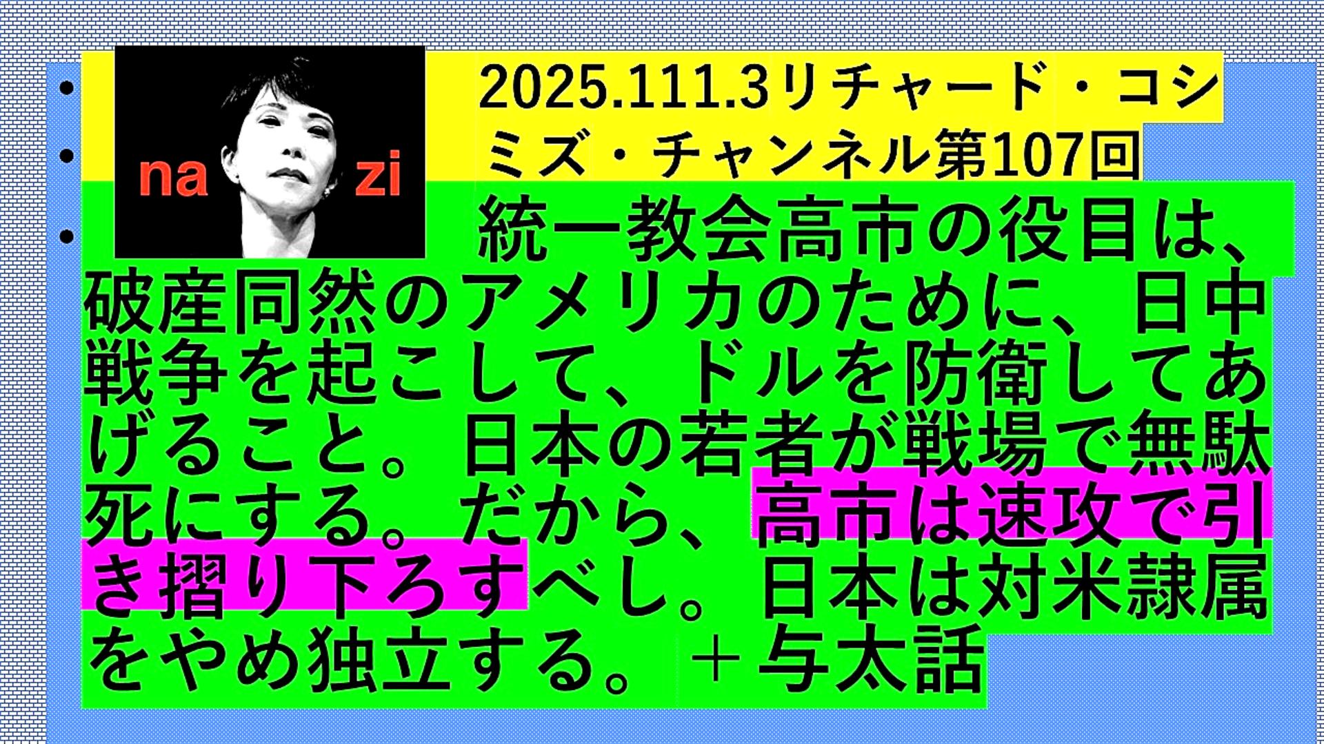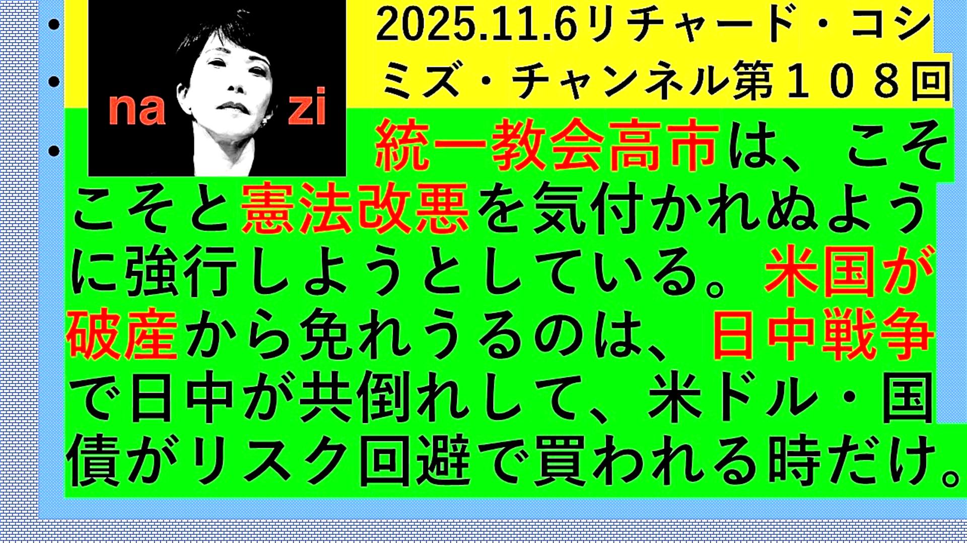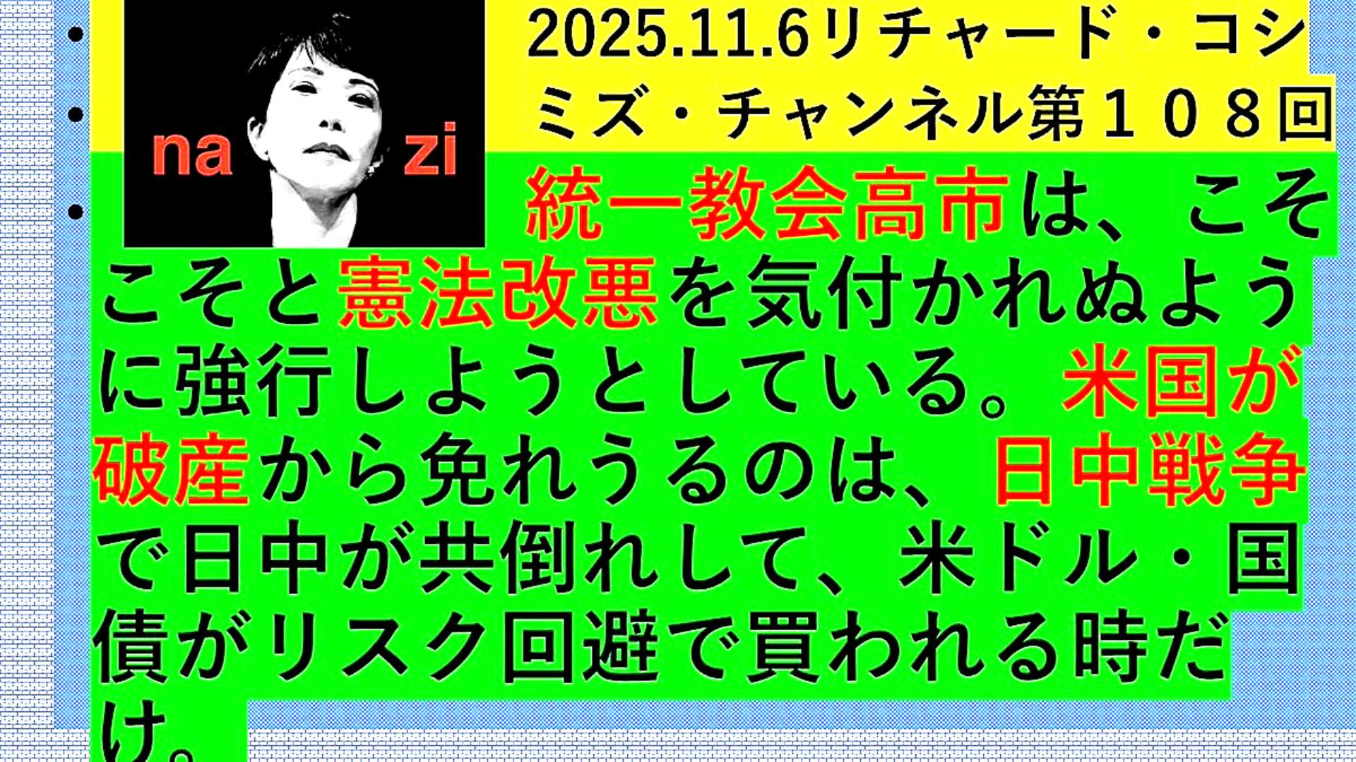 『リチャード・コシミズ「Internet Lecture」』 「『統一教会・高市早苗』の『役目』は、『破産』同然の『アメリカ』のために、『日中戦争』を起こして、『ドル』を『防衛』してあげること。『日本』の『若者』が『戦場』で『無駄死に』する。だから、『高市早苗』は『速攻』で『引き摺り下ろす』べし。『日本』は『対米隷属』をやめ『独立』する。+『与太話』」 |