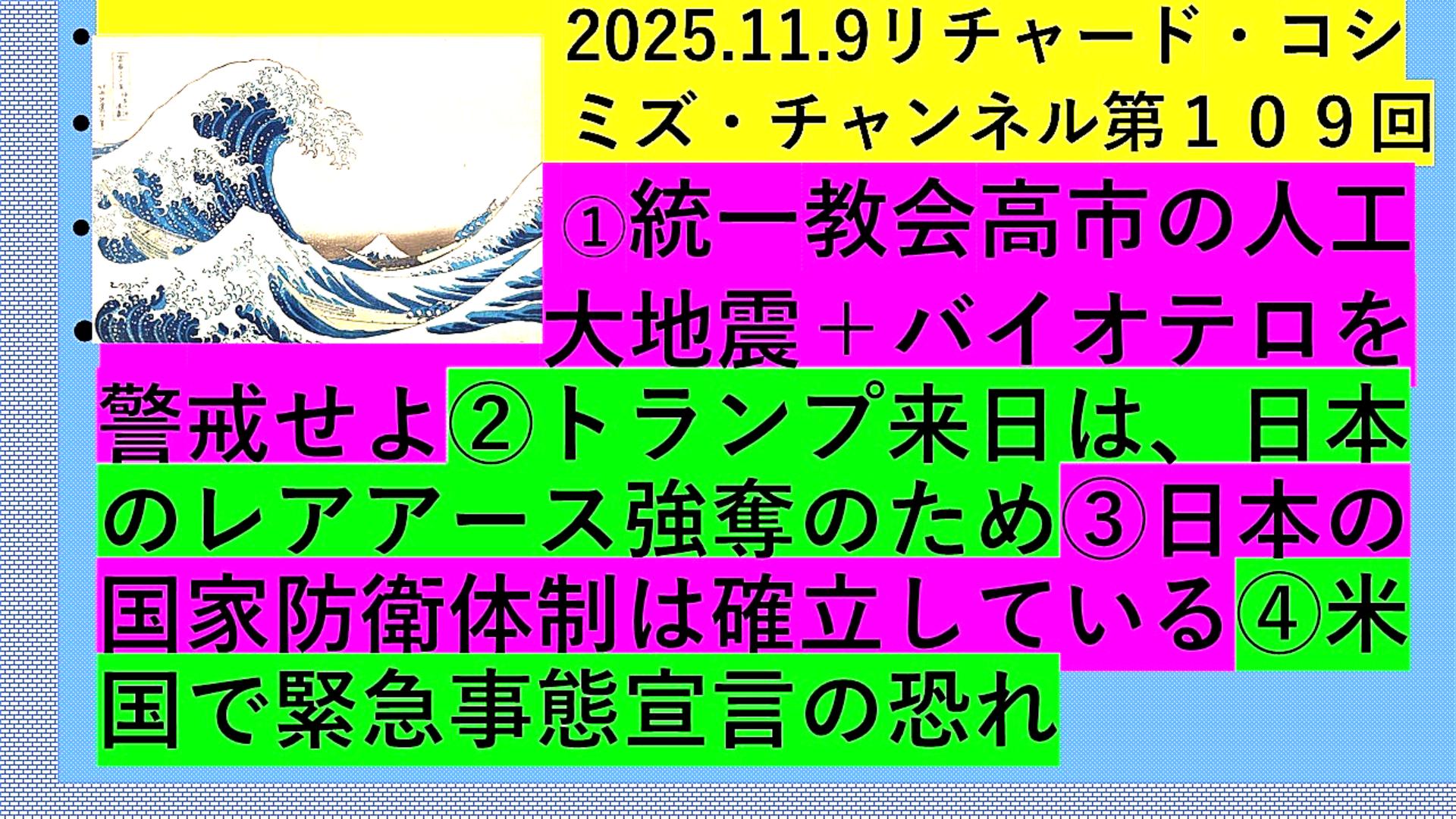 「①.『統一教会・高市早苗』の『人工大地震』+『バイオテロ』を『警戒』せよ。②.『トランプ来日』は、『日本』の『レアアース強奪』のため。③.『日本』の『国家防衛体制』は『確立』している。④.『米国』で『緊急事態宣言』の『恐れ』」 |