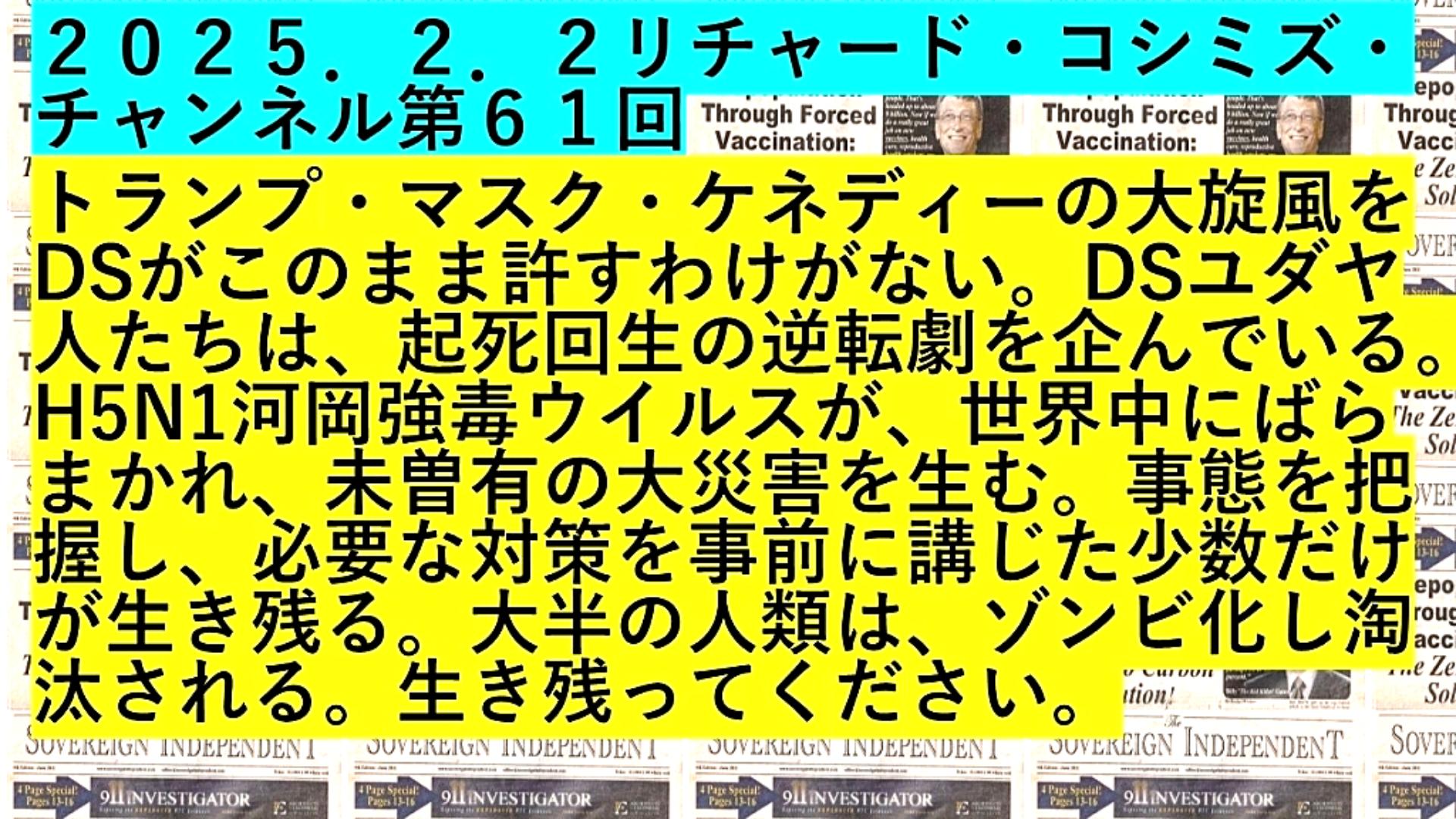 『リチャード・コシミズ「Internet Lecture」』 「『ドナルド・トランプ』・『イーロン・マスク』・『ロバート・ケネディ・ジュニア』の『大旋風』を、『DEEP STATE』がこのまま『許すわけがない』。『DEEP STATEユダヤ人』たちは、『起死回生』の『逆転劇』を『企んでいる』。『H5N1河岡義裕強毒ウイルス』が、『世界中』にばらまかれ、『未曽有』の『大災害』を『生む』。『事態』を『把握』し、『必要』な『対策』を『事前』に講じた『少数』だけが『生き残る』。『大半』の『人類』は、『ゾンビ化』し『淘汰』される。『生き残ってください』」 |