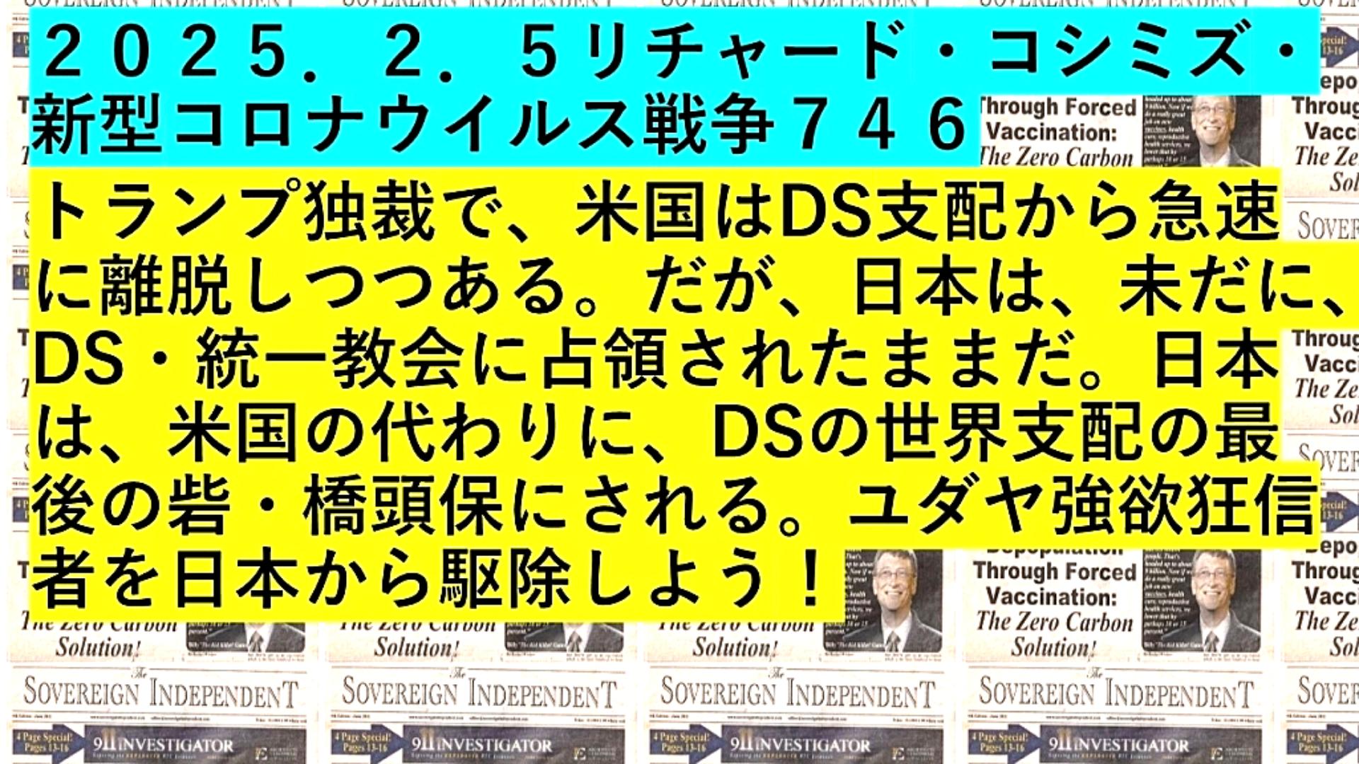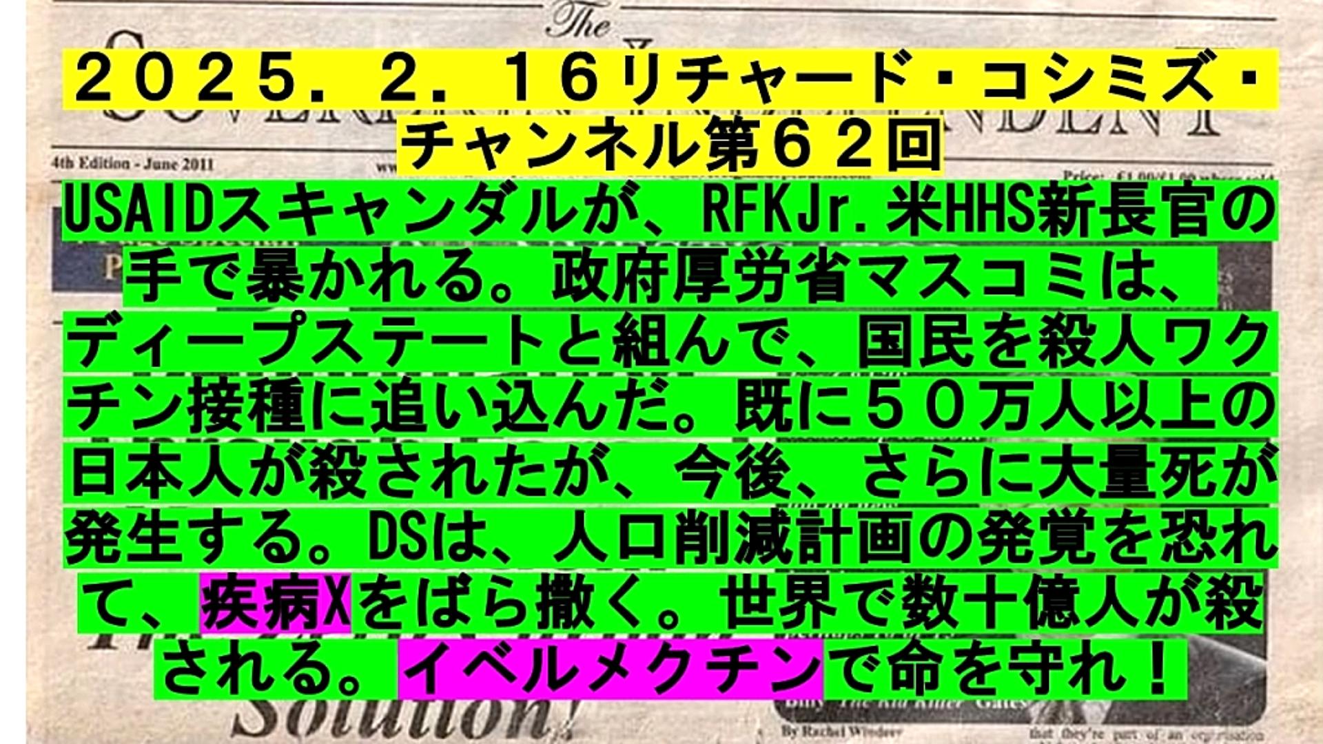 『リチャード・コシミズ「Internet Lecture」』 「『USAID(アメリカ合衆国国際開発庁)スキャンダル』が、『ロバート・ケネディ・ジュニア米保健福祉省新長官』の『手』で『暴かれる』。『政府厚生労働省マスコミ』は、『DEEP STATE』と組んで、『国民』を『殺人ワクチン接種』に『追い込んだ』。既に、『50万人以上』の『日本人』が『殺された』が、今後、さらに『大量死』が『発生』する。『DEEP STATE』は、『人口削減計画』の『発覚』を恐れて、『疾病X』を『ばら撒く』。『世界』で『数十億人』が『殺される』。『イベルメクチン』で『命』を『守れ!』」 |