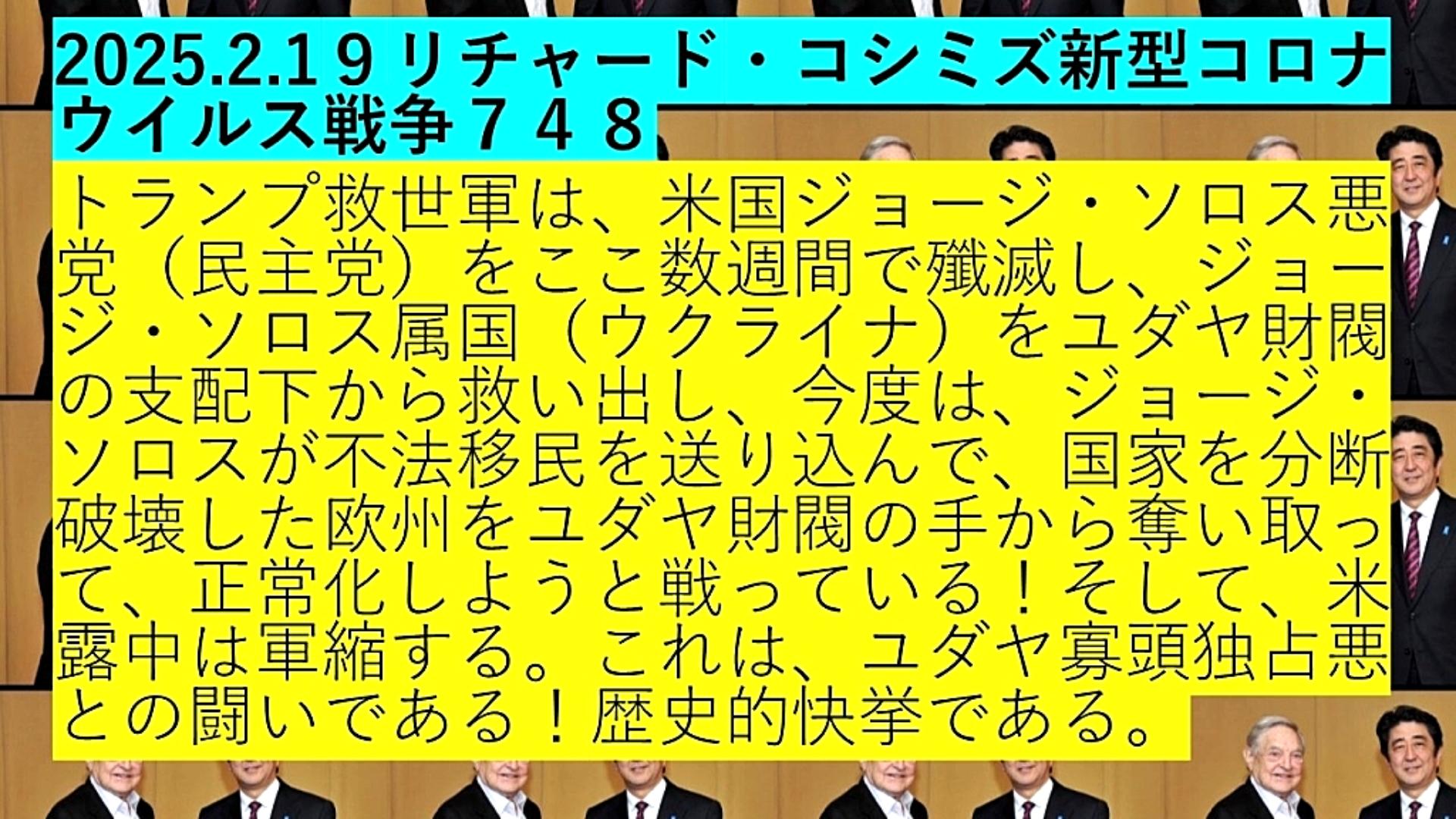 『リチャード・コシミズ「Internet Lecture」』 「『ドナルド・トランプ救世軍』は、『米国ジョージ・ソロス悪党(民主党)』をここ数週間で『殲滅』し、『ジョージ・ソロス属国(ウクライナ)』を『ユダヤ財閥』の『支配下』から『救い出し』、今度は、『ジョージ・ソロス』が『不法移民』を送り込んで、『国家』を『分断破壊』した『欧州』を『ユダヤ財閥』の『手』から『奪い取って』、『正常化』しようと『戦っている』!そして、『米国・露西亜・中国』は『軍縮』する。これは、『ユダヤ寡頭独占悪』との『闘い』である!『歴史的快挙』である」 |