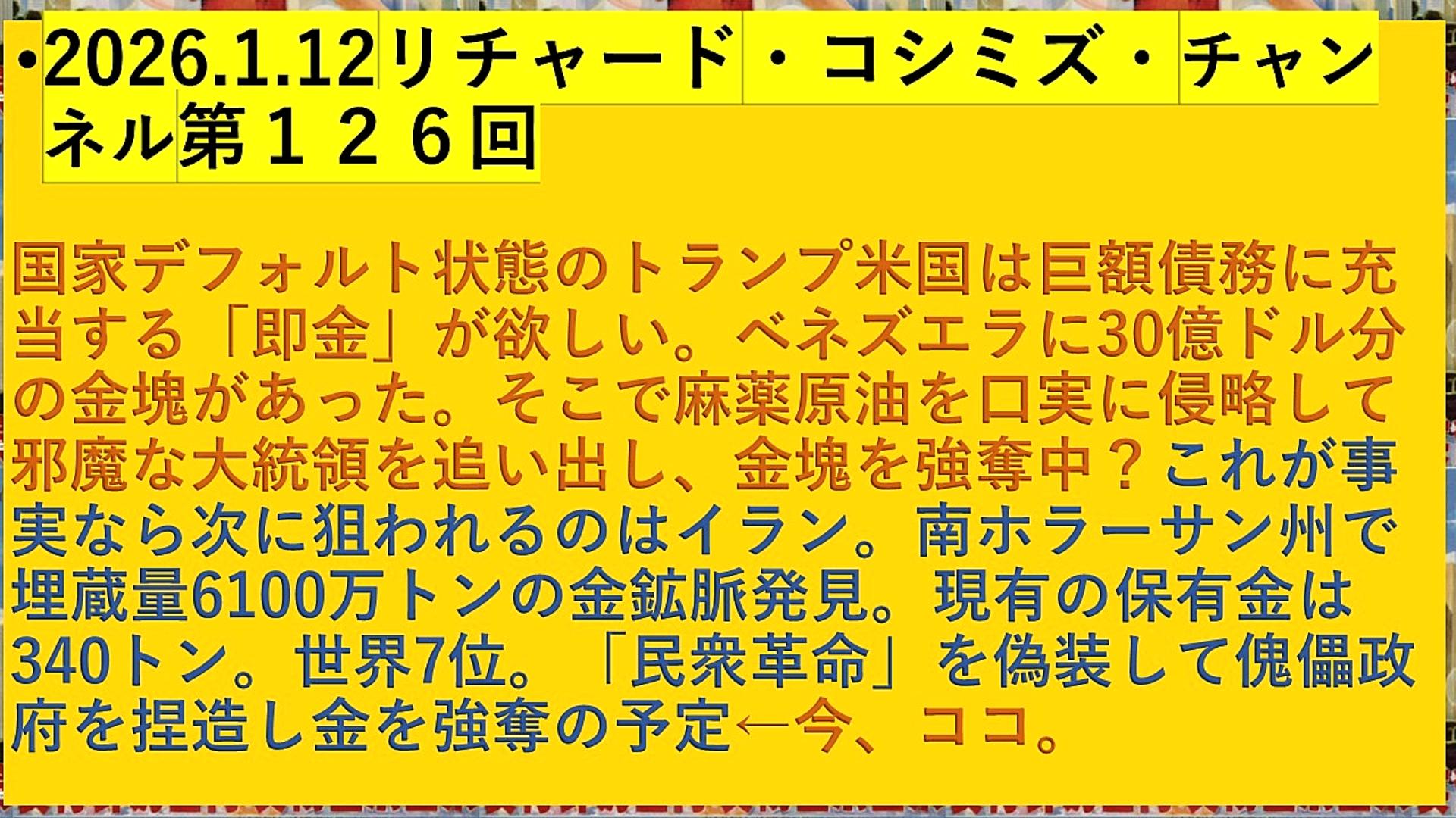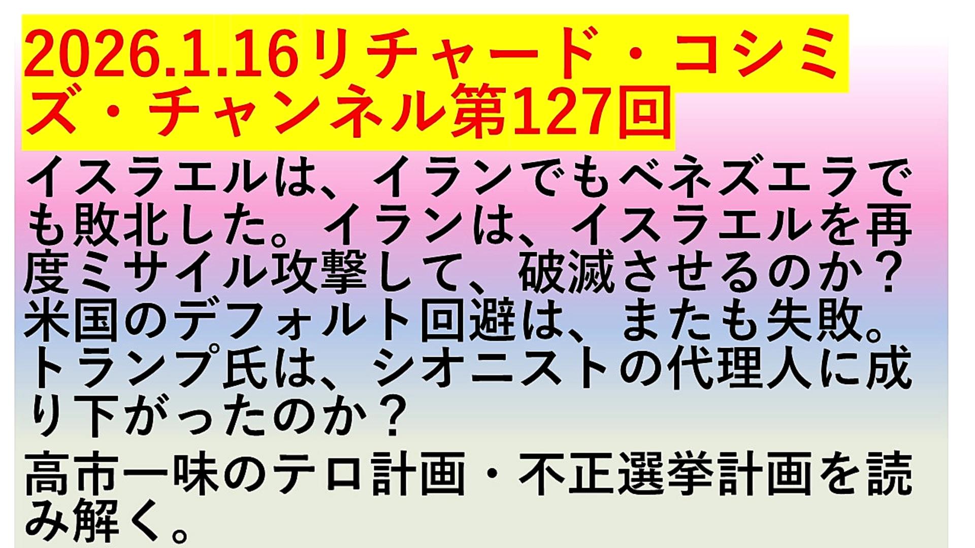「『イスラエル』は、『イラン』でも『ベネズエラ』でも『敗北』した。『イラン』は、『イスラエル』を再度『ミサイル攻撃』して、『破滅』させるのか?『米国』の『デフォルト回避』は、またも『失敗』。『ドナルド・トランプ氏』は、『シオニスト』の『代理人』に『成り下がった』のか?『高市早苗一味』の『テロ計画』・『不正選挙計画』を『読み解く』」 |